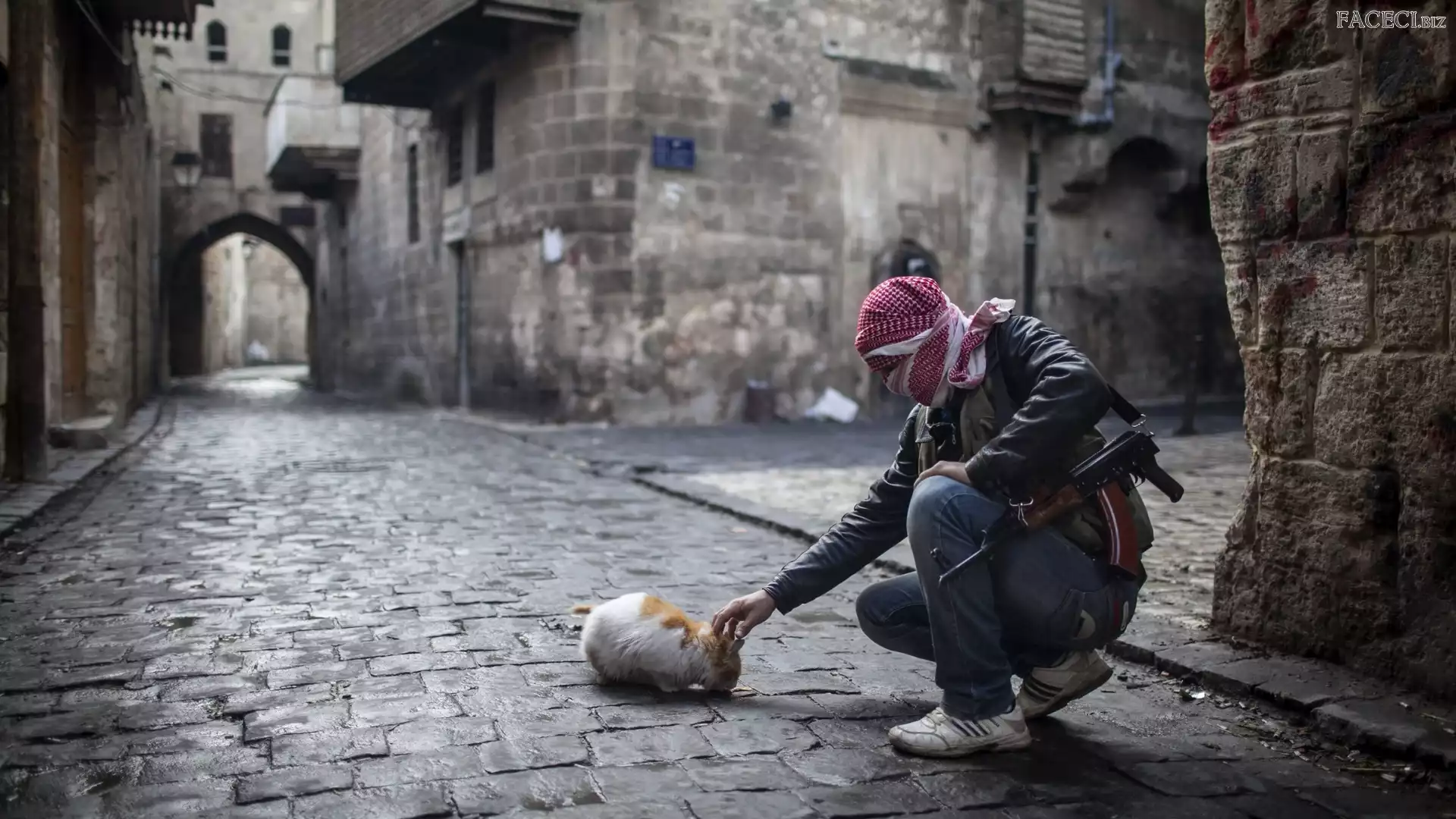 Kot, Karabin, Uliczka, Budynki, Mężczyzna - faceci.biz